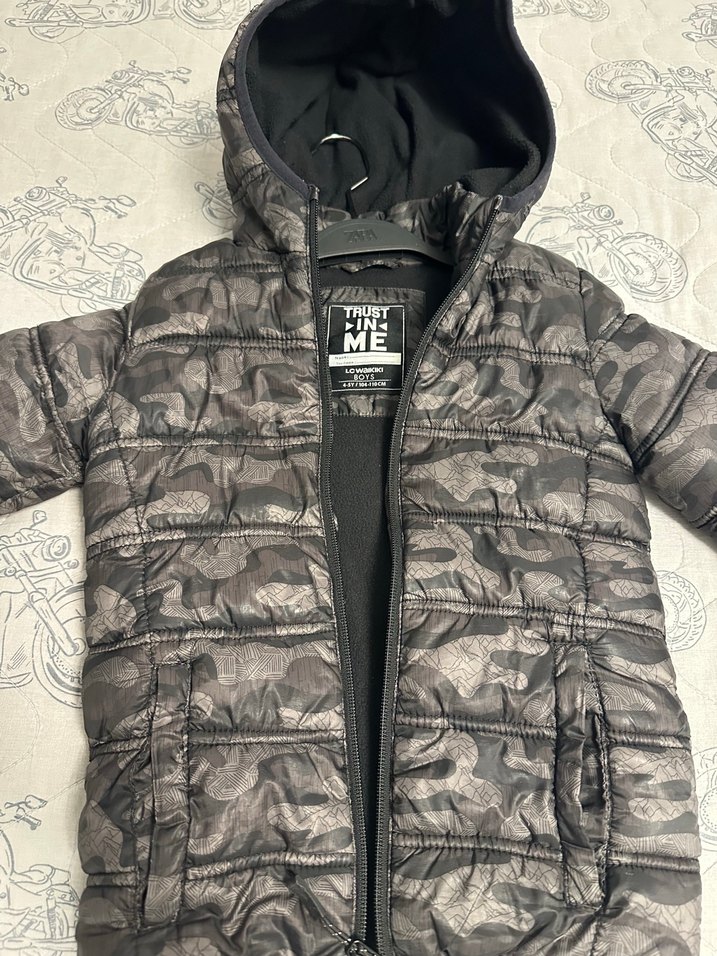 Gri kamuflaj desenli, fermuarlı ve kapüşonlu, yumuşak kumaştan yapılmış erkek çocuk montu. Rahat ve şık sokak stili için uygun.