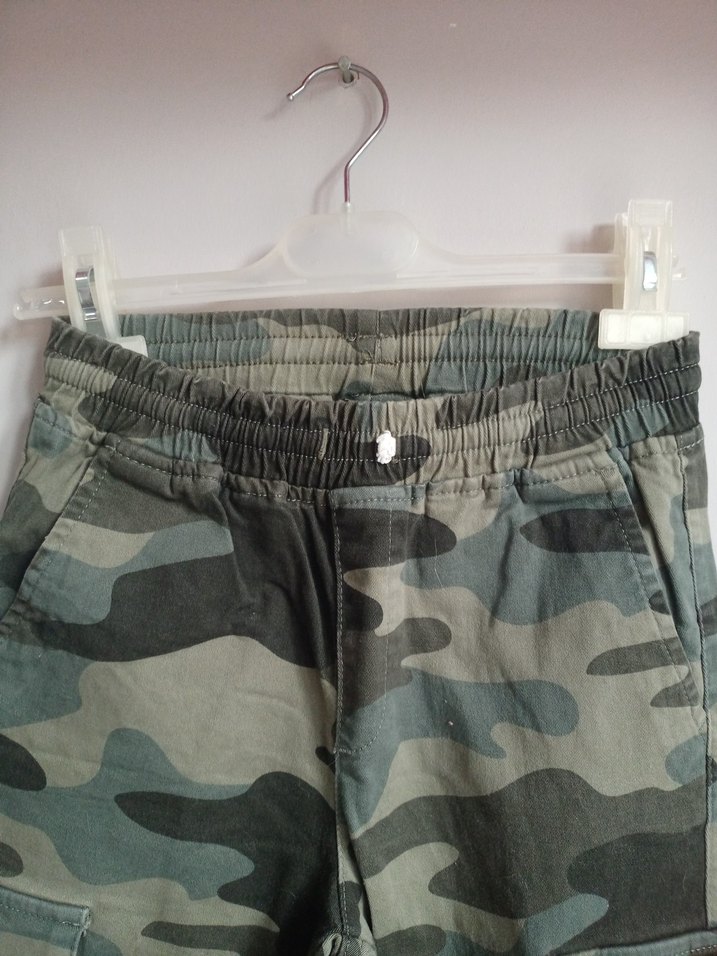 Gri kamuflaj desenli, pamuklu kumaştan yapılmış erkek çocuk bol pantolon. Düğmeli ve rahat elastik bel bantlı.