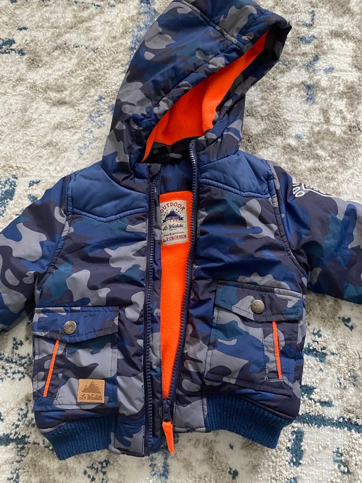 Erkek çocuklar için kamuflaj desenli, kürk detaylı ve kesimli mont. Kapüşonlu, cep detaylı ve sıcak tutan iç astarlı. Sokak stili için uygun. Arka yazısında yıkamadan dolayı soyulmalar var