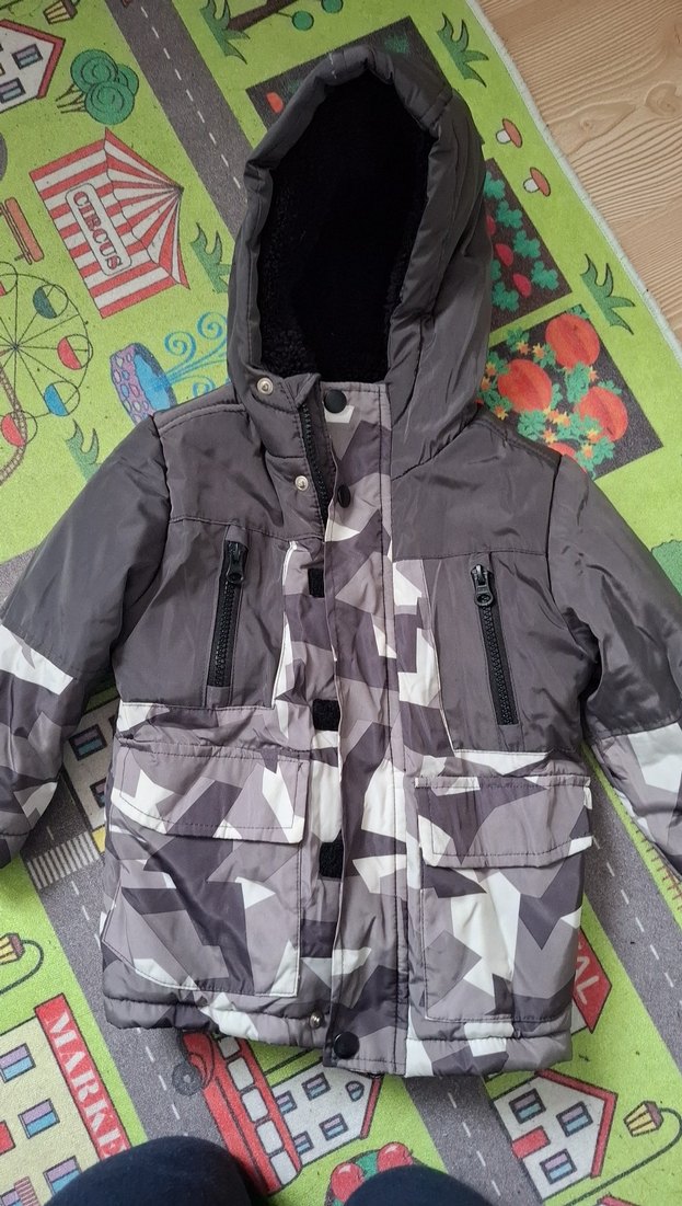 Fermuarlı önü ve çoklu cepleri olan, gri kamuflaj desenli, kapüşonlu ve içi yumuşak polar astarlı erkek çocuk montu. Sokak stili için uygun, dar kesim. çok az kullanıldı yepyeni