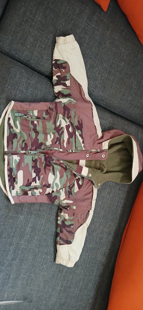 Koyu kahverengi kamuflaj desenli, kapüşonlu ve fermuarlı, notched lapel yakalı erkek çocuk montudur. Sentetik kumaştan, trend sokak giyimi için uygundur. İçi polar ince polarlı mont.Kusursuz..1-3 yaş arası kullanılabilir.
