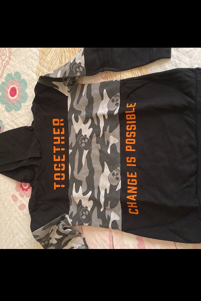 Erkek çocuklar için uzun kollu, kapüşonlu ve fermuarlı sweatshirt. Kamuflaj desenli, turuncu yazılı, rahat kesim, yumuşak ve sıcak kumaştan üretilmiştir. Hiçbir deformasyon yoktur.