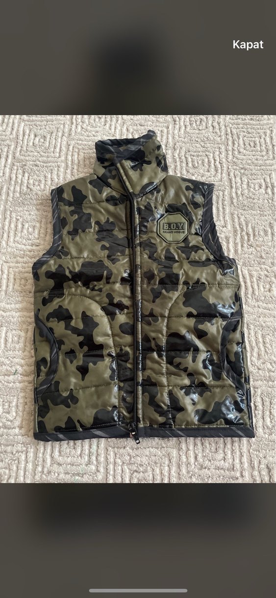 kamuflaj desenli, kapüşonsuz, fermuarlı, boğazlı ve dar kesim erkek çocuk yeleği. Sentetik kumaştan, trend sokak stili için uygundur.