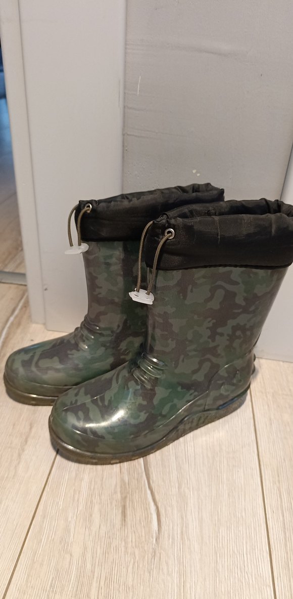 Erkek çocuklar için koyu yeşil kamuflaj desenli kauçuk botlar, kolay kullanım .pratik bağcıklı üst kısma sahiptir. sayılı giyildi.bir tanesinin üst kısmında küçük sökük var, dikilebilir 32-33 no
