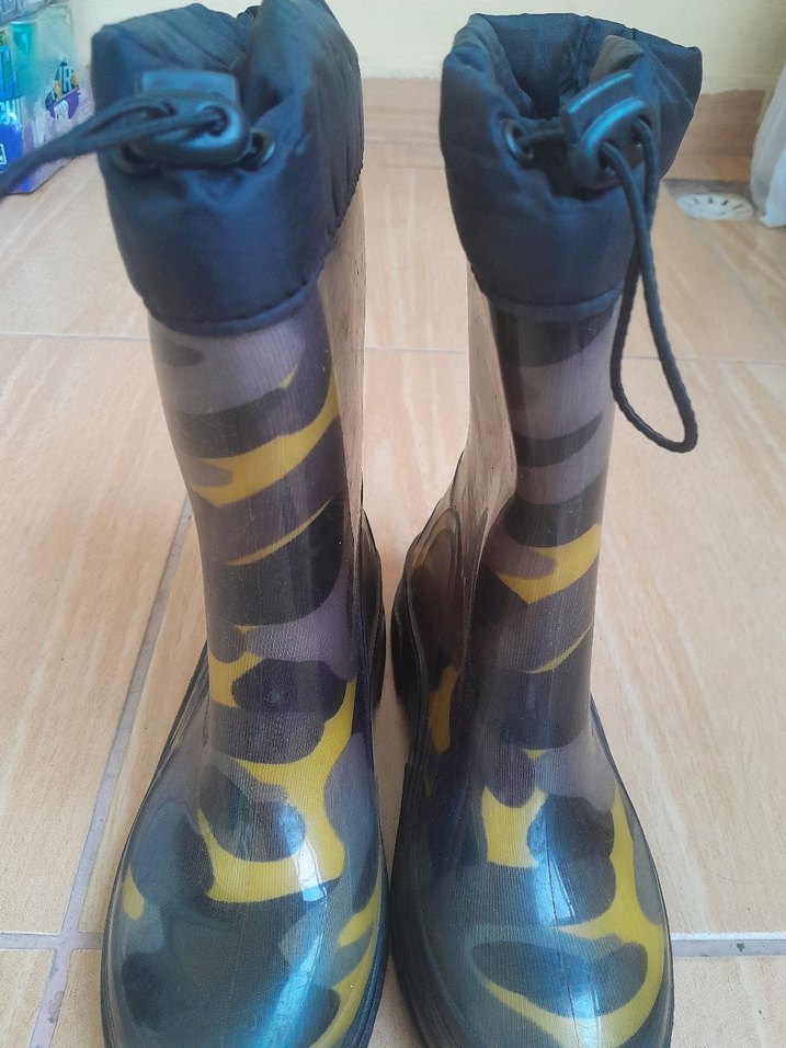 Erkek çocuklar için lastik çizme, koyu sarı kamuflaj deseni, tokalı ve bağcıklı tasarımıyla şık ve avant-garde bir görünüm sunar.