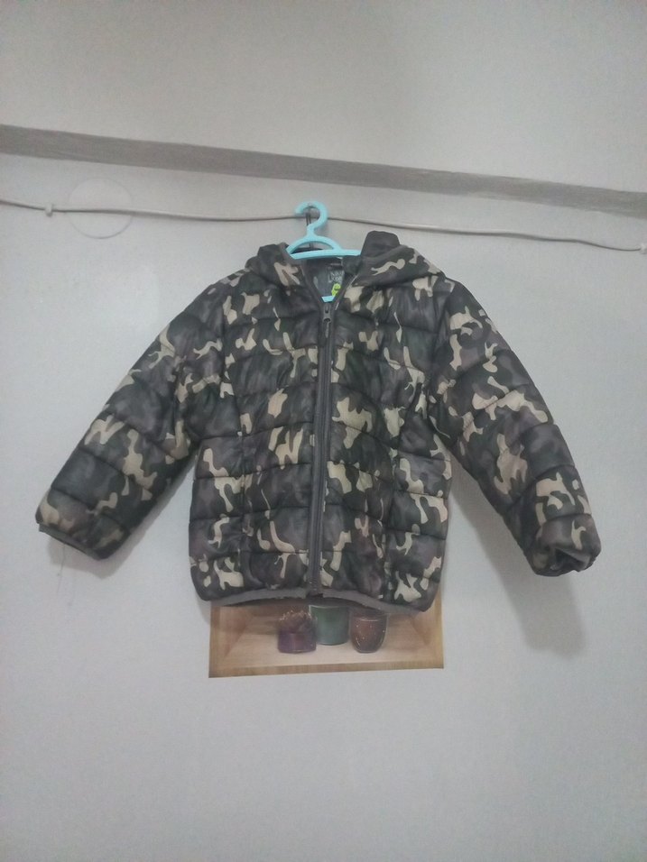 Erkek çocuklar için kamuflaj desenli, gri renkli, yumuşak ve sıcak kumaştan yapılmış, kemerli ve kesimli mont. Notlu yaka ile sokak stili sunar.