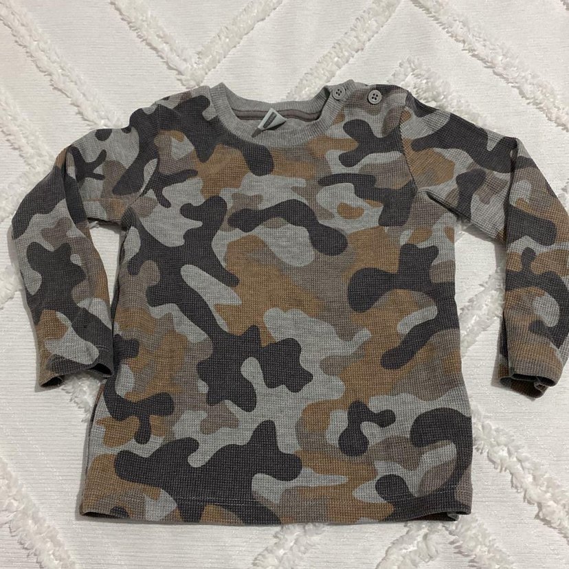 Gri ve kahverengi kamuflaj desenli, düğmeli, uzun kollu, bol kesim erkek çocuk sweatshirtü. Yumuşak ve sıcak kumaştan üretilmiştir.