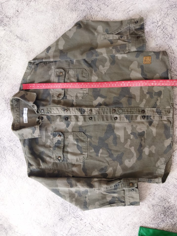 Erkek çocuklar için kamuflaj desenli, düğmeli ön ve kesik yaka detaylı ceket. Gevşek kesim, sentetik kumaştan, haki ve gri tonlarında, sokak modasına uygun.