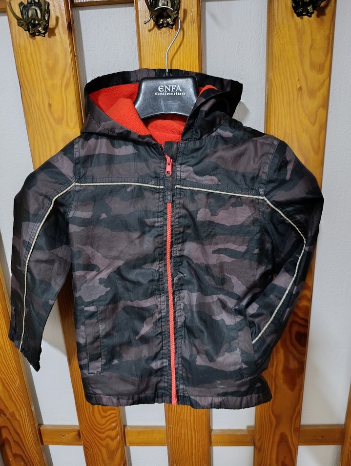 Erkek çocuk için kamuflaj desenli, fermuarlı ve kapüşonlu mont. Yumuşak ve sıcak fleece astarlı, dar kesim ve notched lapel yaka detaylıdır.