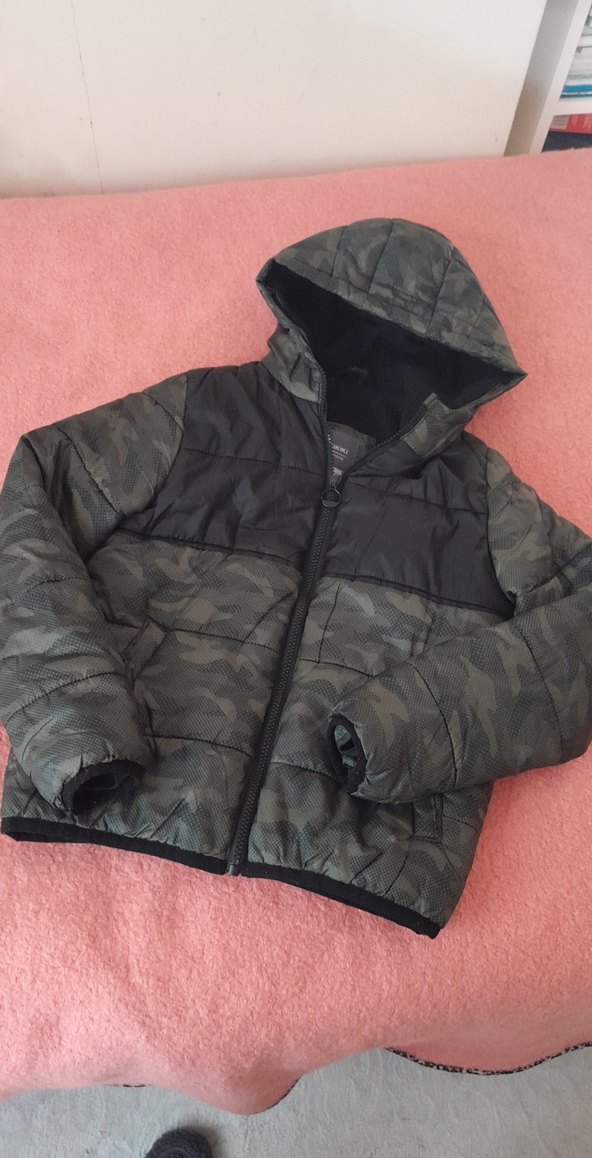 Erkek çocuklar için kamuflaj desenli, kapüşonlu ve fermuarlı, yumuşak ve sıcak kumaştan yapılmış dar kesim mont.
