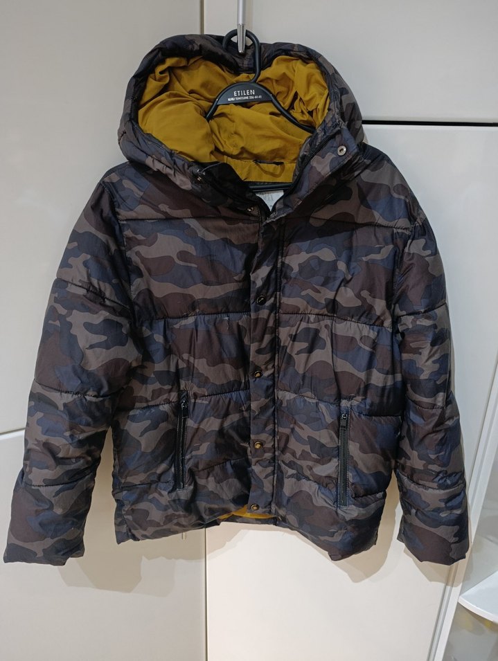 Erkek çocuklar için kapüşonlu, düğmeli, kamuflaj desenli mont. Rahat kesimi ve yumuşak, sıcak kumaşı ile koyu kahverengi tonlarında.