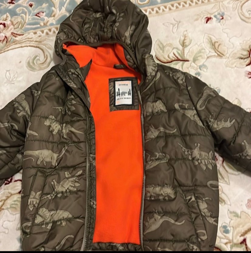 Erkek çocuk için kamuflaj desenli, kapüşonlu ve fermuarlı, içi turuncu yumuşak kumaşlı mont. Sokak stili için uygun, dar kesim.
