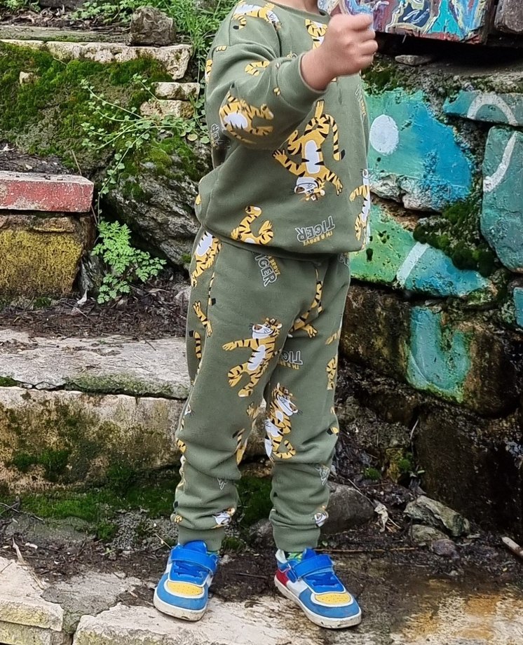 Erkek çocuk sweatshirt, bol kesim, uzun kollu ve yuvarlak yaka. Yumuşak tekstil malzemeden, kaplan baskıları ve haki yeşil tonlarında.