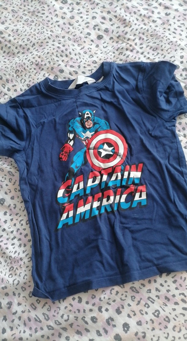 Pamuklu, kısa kollu, mavi renkli ve düğmeli, Kaptan Amerika baskılı erkek çocuk tişörtü. Dar kesimli ve yuvarlak yaka. ♂️