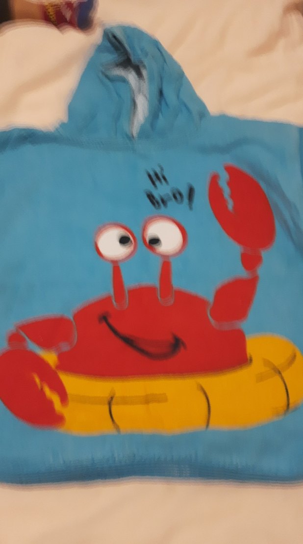 Canlı renklerde, kapüşonlu erkek çocuk bornozu, mavi zemin üzerinde neşeli yengeç baskısına sahiptir. Rahat ve eğlencelidir. herhangi bir kusuru yok tur 1-2 yaştır 3 yaşa kadar kullandık