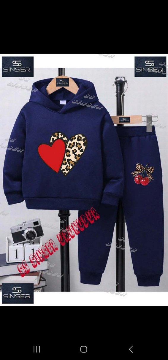 Erkek çocuklar için kapüşonlu, baskılı ve rahat kesim eşofman takımı. Koyu mavi, yumuşak örgü kumaştan üretilmiştir. Kapüşonda kırmızı ve leopar desen kalp, pantolonda kiraz baskısı bulunur.