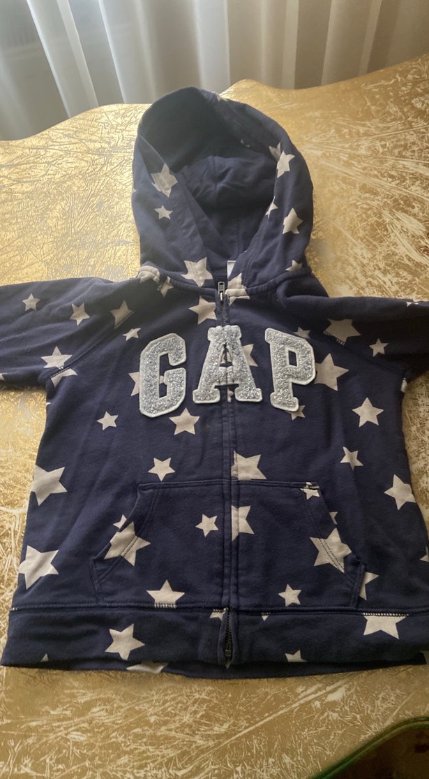 Koyu mavi renkli, yumuşak kumaşlı, kapüşonlu ve fermuarlı erkek çocuk sweatshirtü. Yıldız desenli ve GAP logolu, sokak tarzına uygun. ⭐