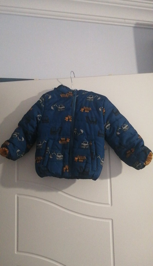 Erkek çocuklar için kapüşonlu, düğmeli ve baskılı koyu mavi renkte, yumuşak ve sıcak kumaştan yapılmış fit kesim mont.