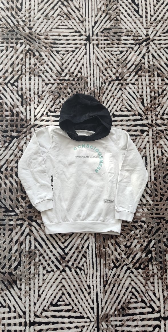 Erkek çocuk için uzun kollu, yuvarlak yakalı, bol kesim ve yumuşak fleece kumaştan yapılmış. Beyaz renk üzerine gri baskılar ve siyah kapüşonlu. çok az kullanıldı temiz ve sorunsuzdur arkası desenli. farklı modeller için dolabıma bakabilirsiniz