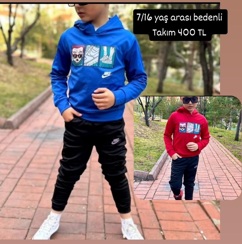 Erkek çocuklar için bol kesim, yumuşak ve sıcak kumaştan kapüşonlu baskılı takım. 7-16 yaş arası bedenler mevcuttur.