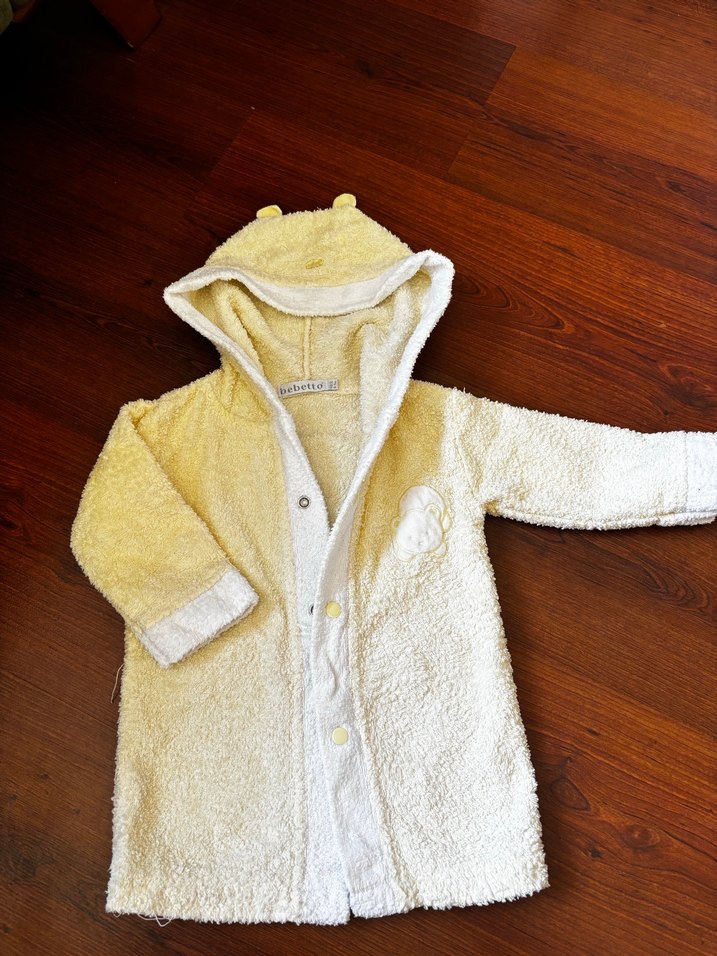 Pastel beyaz renkli, kapüşonlu ve çıtçıt düğmeli erkek çocuk bornozu, yumuşak ve sıcak dokusuyla rahat kullanım sunar. Desensiz ve konforludur. 6/9 ay arası