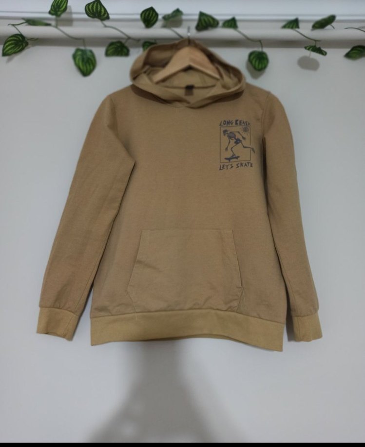 Bej renkli, kapüşonlu ve uzun kollu erkek çocuk sweatshirt üstü lacivert baskılı, bol kesim ve yumuşak, sıcak dokuda, rahat sokak stili için uygun.