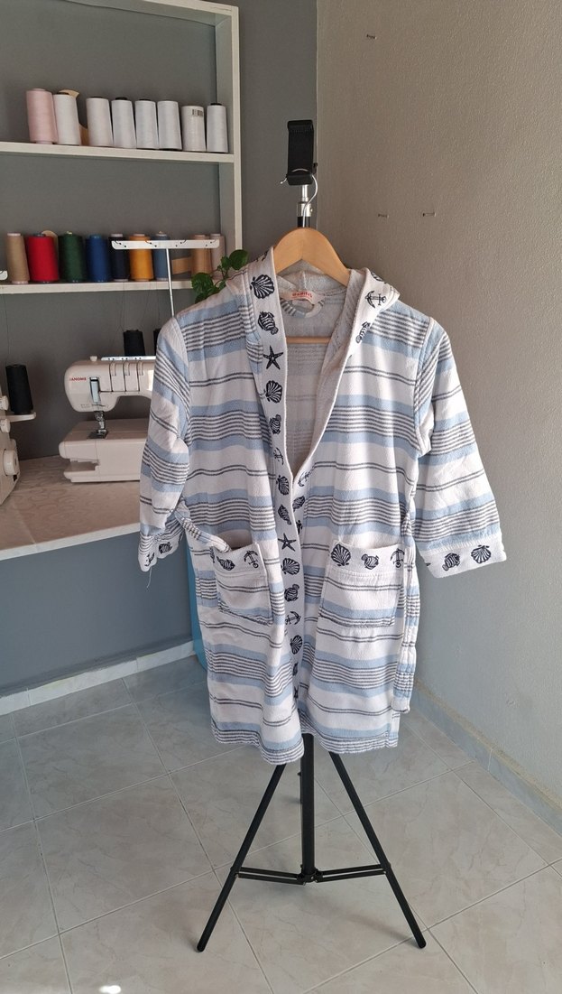 Erkek çocuk için kapüşonlu, cepli bornoz. 9_10yaş Mavi çizgiler ve deniz temalı desenlerle süslenmiştir. Yumuşak kumaştan üretilmiştir.