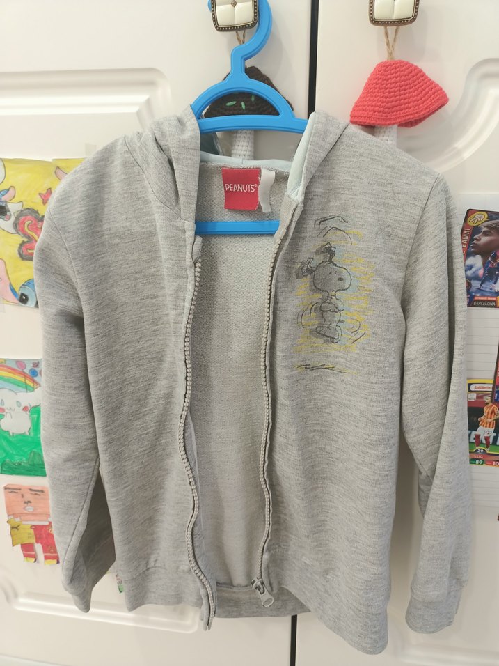 Kapüşonlu, uzun kollu ve fermuarlı bu gri erkek çocuk sweatshirtü, yumuşak ve sıcak kumaştan üretilmiştir. Üzerinde baskılı Snoopy deseni vardır.