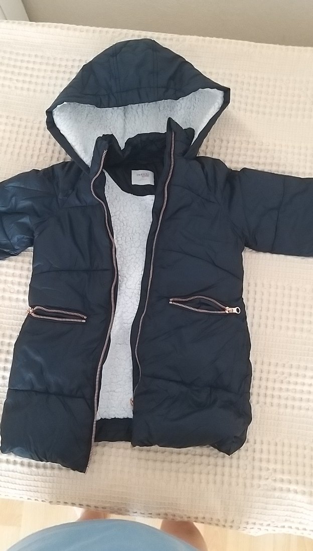 Koyu lacivert renkte, kapüşonlu ve fermuarlı.Etikette kız çocuk yazıyor ama erkek ve kız çocuğa uygun normal kesim mont. Yumuşak peluş beyaz astara sahip,Kollarda peluş yoktur. trend sokak stili için uygun.