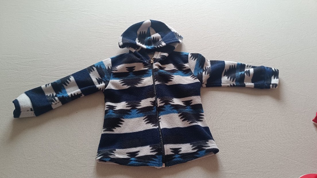 Erkek çocuklar için kapüşonlu, fermuarlı, mavi ve gri tonlarında batik desenli, yumuşak ve sıcak dokulu dar kesim ceket.