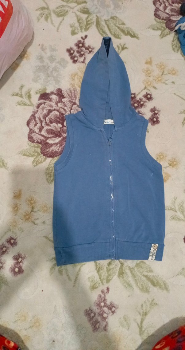 Erkek çocuklar için kapüşonlu, fermuarlı, kolsuz mavi yelek. Yumuşak ve sıcak kumaştan, rahat sokak stili için uygun.