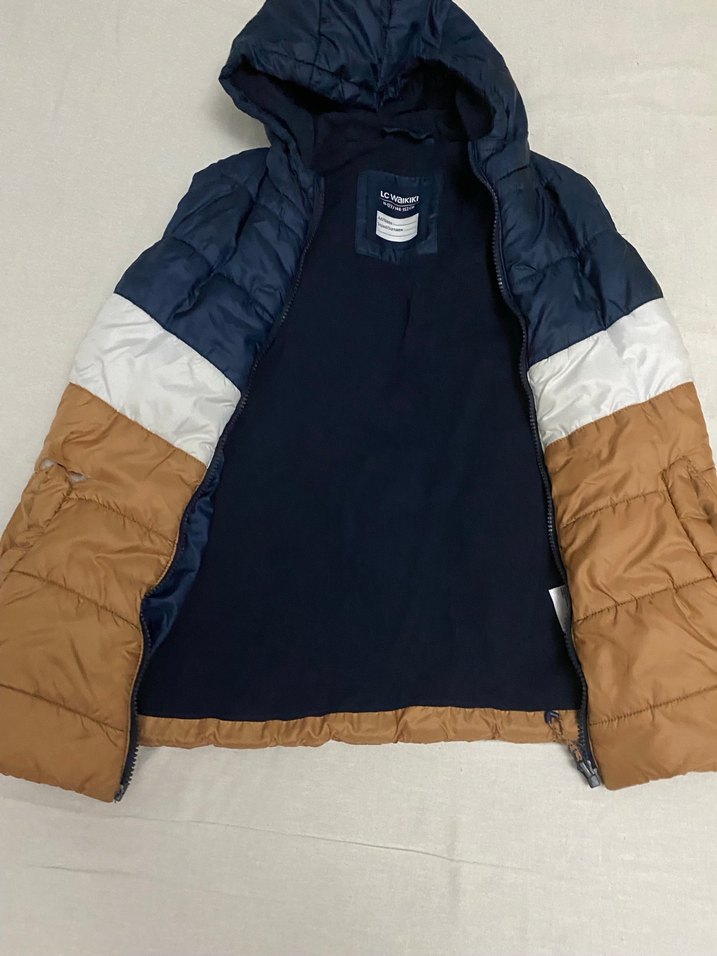 Erkek çocuklar için fermuarlı, kapüşonlu ve fitted kesim mont. Koyu mavi, beyaz ve kahverengi renklerle streetwear tarzında, içi yumuşak fleece ile kaplıdır.
