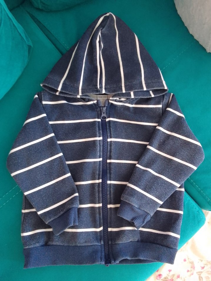 Erkek çocuklar için kapüşonlu ve fermuarlı sweatshirt, yumuşak ve sıcak kumaştan. Uzun kollu ve dar kesim, mavi ve gri çizgili desenli, günlük kullanım için uygundur.