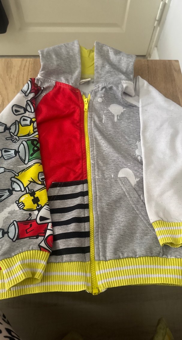 Fermuarlı ve kapüşonlu, uzun kollu erkek çocuk sweatshirtü. Yumuşak tekstil kumaştan, gri, kırmızı ve sarı tonlarında çizgili ve grafiti desenli baskılı tasarıma sahip. Sokak tarzı için uygun.