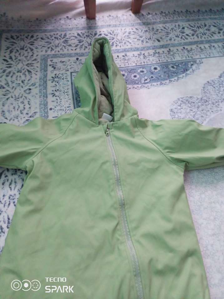Fermuarlı ve kapüşonlu, pastel yeşil renkte, yumuşak ve sıcak kumaştan erkek çocuk yağmurluğu. Sokak stili için uygun, ince kesim.