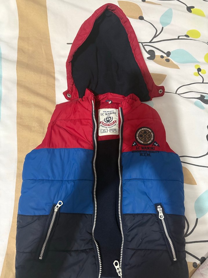 Erkek çocuklar için kapüşonlu, fermuarlı ve kesimi vücuda oturan yelek. Yumuşak ve sıcak kumaştan, çok renkli baskılı, trend sokak stili için uygundur.