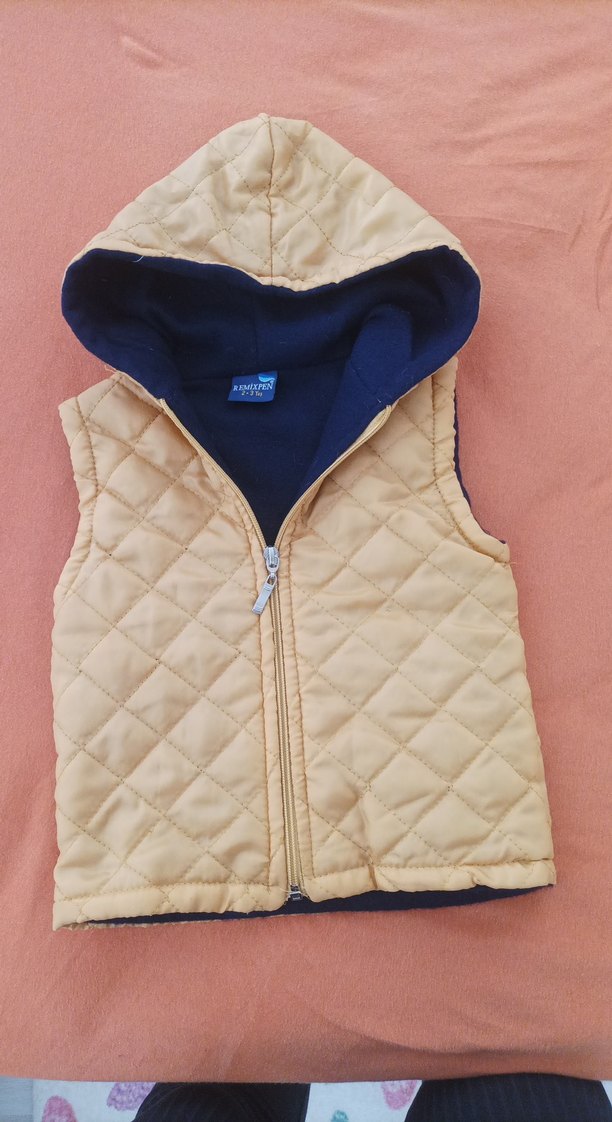 Erkek çocuk için kapüşonlu, fermuarlı ve kolsuz yelek. Pastel bej renkte, yumuşak ve sıcak kumaştan, dar kesimle tasarlanmıştır.