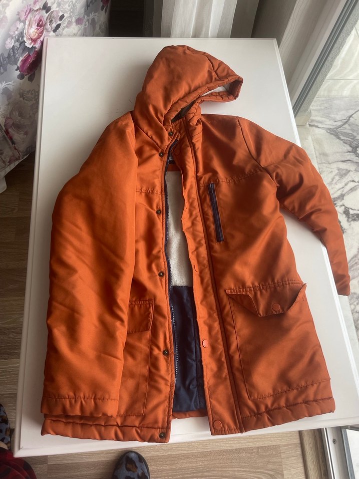 Parlak kahverengi, kapüşonlu ve fermuarlı cepleri olan, ince kesim erkek çocuk kabanı. Yumuşak ve sıcak kumaş, sokak modasına uygun. Renk kiremit rengi
