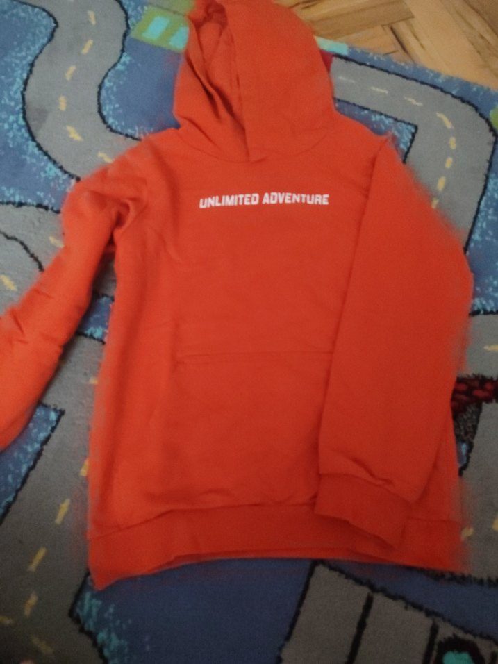 Kırmızı kapüşonlu, uzun kollu, rahat kesim erkek çocuk sweatshirtü. Göğsünde "UNLIMITED ADVENTURE" yazısı bulunur. Sokak stili için uygundur.