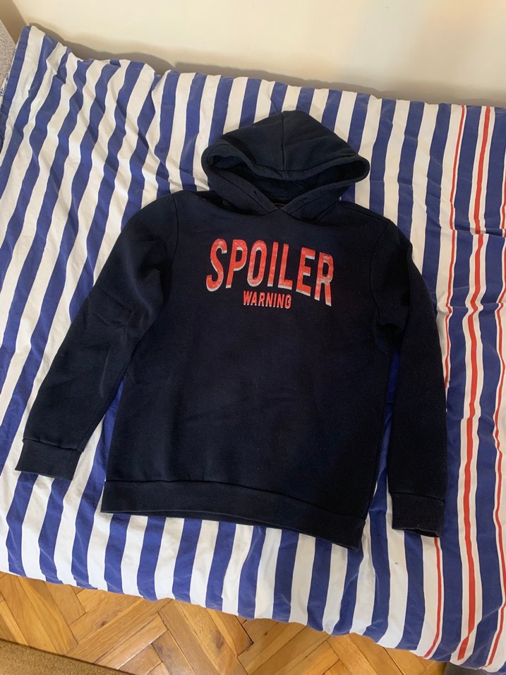 Erkek çocuk için kapüşonlu, uzun kollu ve regular fit kesime sahip koyu mavi sweatshirt. Yumuşak ve sıcak kumaştan, önünde "SPOILER WARNING" baskısı ve fırfır detayları bulunur.