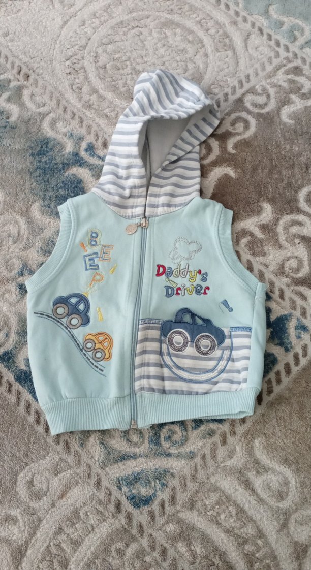 Fermuarlı, kapüşonlu ve baskılı araba desenli mavi yelek. Yumuşak ve sıcak kumaştan, fit kesimle trendy casual tarzda.