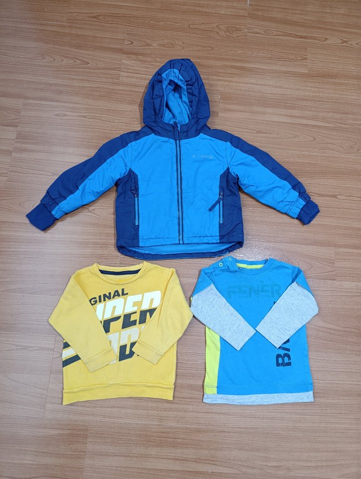Erkek çocuklar için mavi, kapüşonlu, renkli baskılı, sokak tarzı, yumuşak ve rahat polar kumaştan yapılmış, yapışkan bantlı dar kesim mont.