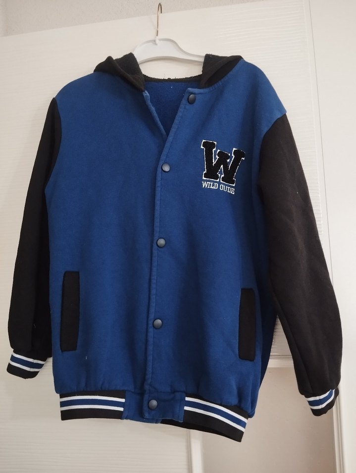 Erkek çocuk için kapüşonlu, düğmeli ve baskılı desenli mavi siyah renklerde, rahat kesim ve yumuşak sıcak kumaştan streetwear ceket.