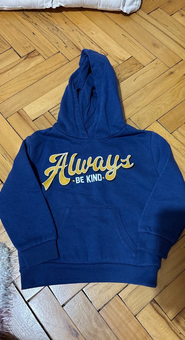 Erkek çocuklar için mavi kapüşonlu sweatshirt, uzun kollu ve bol kesim. Yumuşak ve sıcak kumaş, fermuarlı ve "Always BE KIND." yazılı baskılıdır.