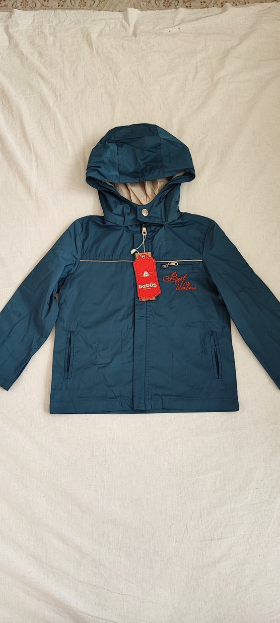 Erkek çocuklar için kapüşonlu, renkli baskılı ve çıtçıtlı yakalı, fermuarlı cep detaylı, yumuşak ve sıcak kumaştan üretilmiş mavi yağmurluk.