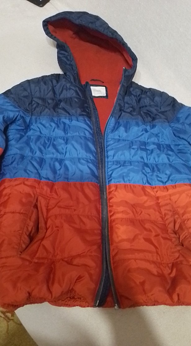 Erkek çocuk için kapüşonlu ve fermuarlı, yumuşak ve sıcak kumaştan mont. Koyu mavi, açık mavi ve turuncu renk bloklu tasarıma sahip fermuari çıkmış yapilabilir