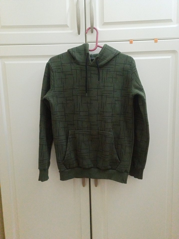 Erkek çocuklar için örgü dokulu, bol kesim uzun kollu sweatshirt. Yuvarlak yaka, yumuşak ve sıcak kumaştan, yeşil renkte ve hafif gri desenli. Rahat sokak stili için uygundur. tertemiz sorunsuz yeni gibi içi polarlı sıcak tutar etiket S fakat dar kalıp erkek çocuk için uygundur 12-13 yaş uyumlu.olculerine bakınız iki koltuk altı arasi 48 boyu 61cm.marka temsili.