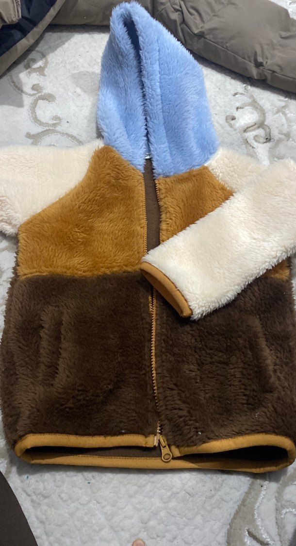 Kapüşonlu, peluş kumaştan yapılmış, kahverengi ve krem tonlarında, sokak stiline uygun, erkek çocuklar için dar kesim ceket.