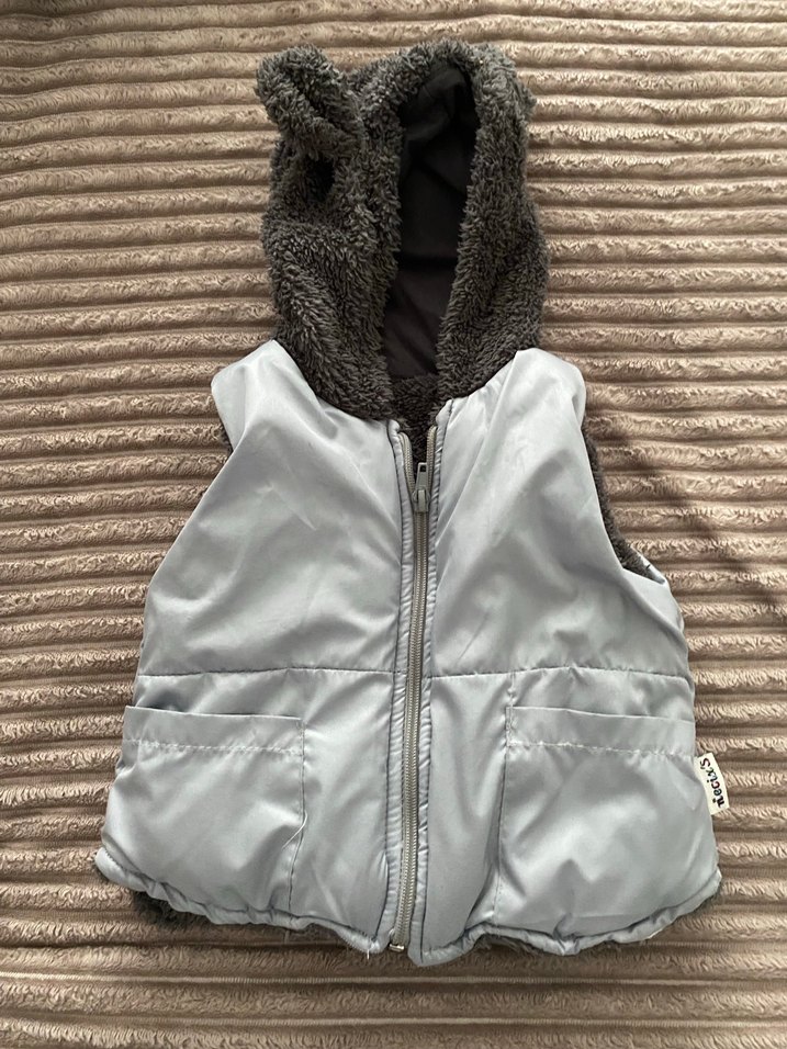 Erkek çocuklar için kapüşonlu, peluş detaylı, gri renkte, kolsuz ve dar kesim yelek. Dış kısmı düzgün ve önünde iki cep bulunur. Sokak tarzına uygun.