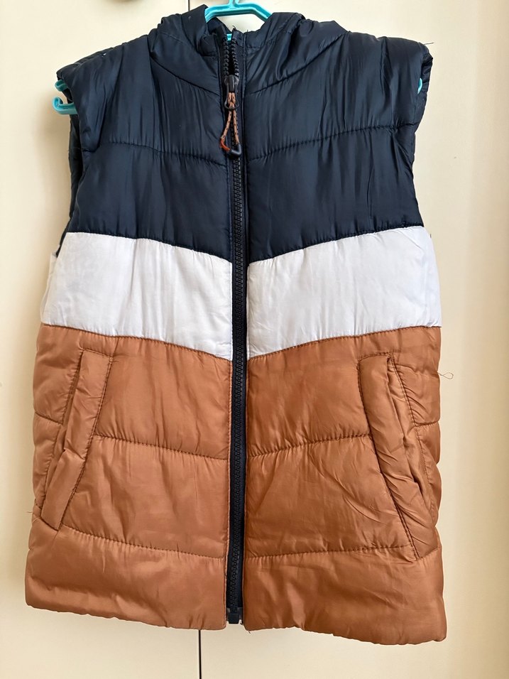 Koyu kahverengi, beyaz ve siyah renk bloklu, sentetik kumaştan, kapüşonlu ve fermuarlı, erkek çocuklar için fit kesim yelek.
